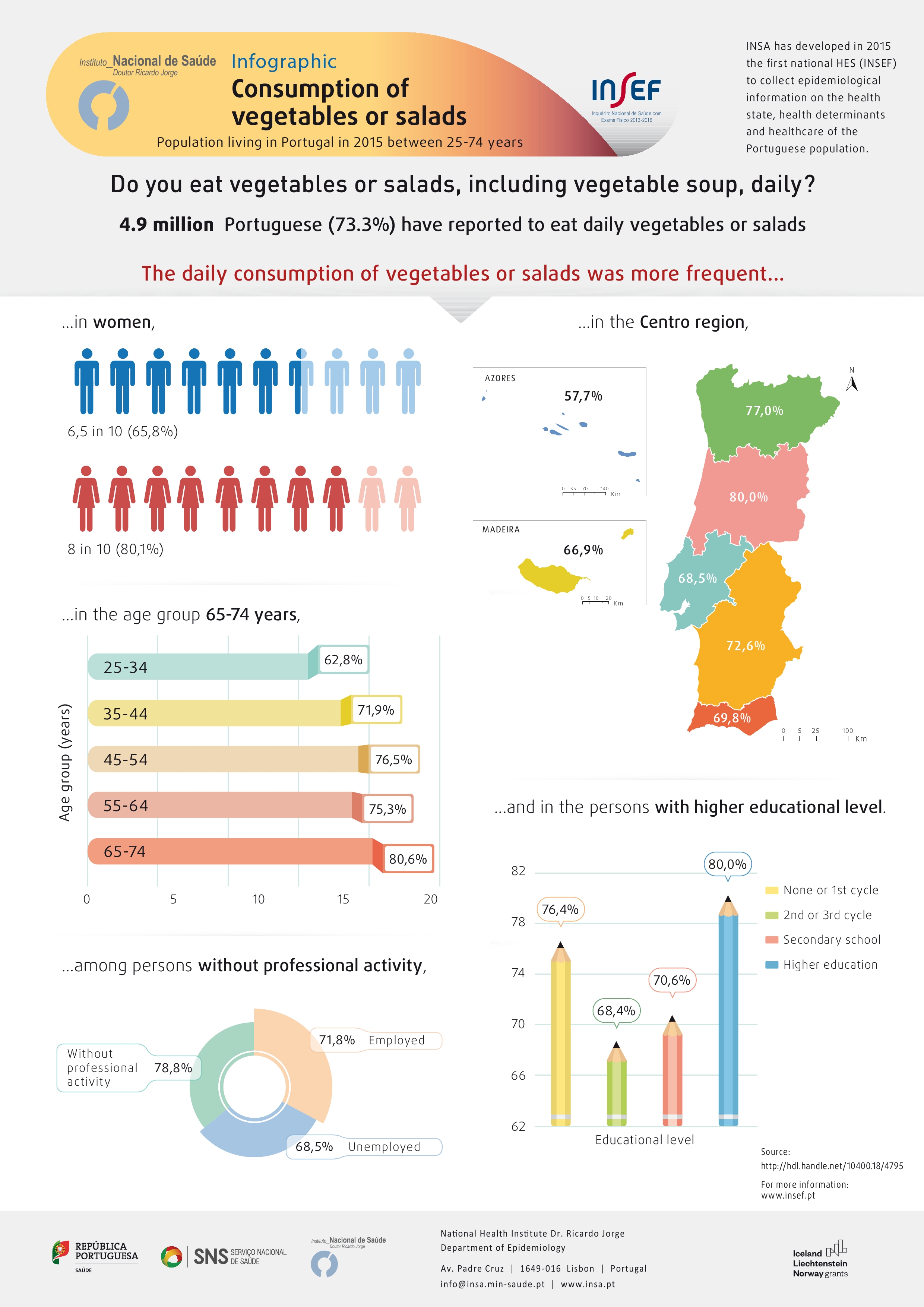 Para uma melhor disseminação dos resultados do INSEF, disponibiliza-se em infográfico uma mensagem clara e sucinta sobre este tópico relacionado com a saúde dos portugueses. Os dados apresentados referem-se à população residente em Portugal em 2015 com idades compreendidas entre os 25 e os 74 anos e são relativos à questão «Consome vegetais ou saladas, incluindo sopa de legumes, todos os dias», tendo 4.9 milhões de portugueses (73,3%) referido consumir diariamente vegetais ou saladas. O consumo diário de vegetais ou saladas foi mais frequente nas mulheres (80,1%), no grupo etário dos 65-74 anos (80,6%), na Região do Centro (80,0%), nos indivíduos sem atividade profissional (78,8%) e nos indivíduos com mais escolaridade (80,0%). A informação está estratificada por sexo, grupo etário, região, situação perante o trabalho e grau de escolaridade. Promovido e coordenado pelo Departamento de Epidemiologia do Instituto Ricardo Jorge, o primeiro Inquérito Nacional de Saúde com Exame Físico (INSEF) foi desenvolvido em 2015 para recolha de informação epidemiológica sobre o estado, determinantes e cuidados de saúde da população portuguesa. Este Inquérito tem como mais-valia o facto de conjugar informação colhida por entrevista direta ao indivíduo com dados de uma componente objetiva de exame físico e recolha de sangue.