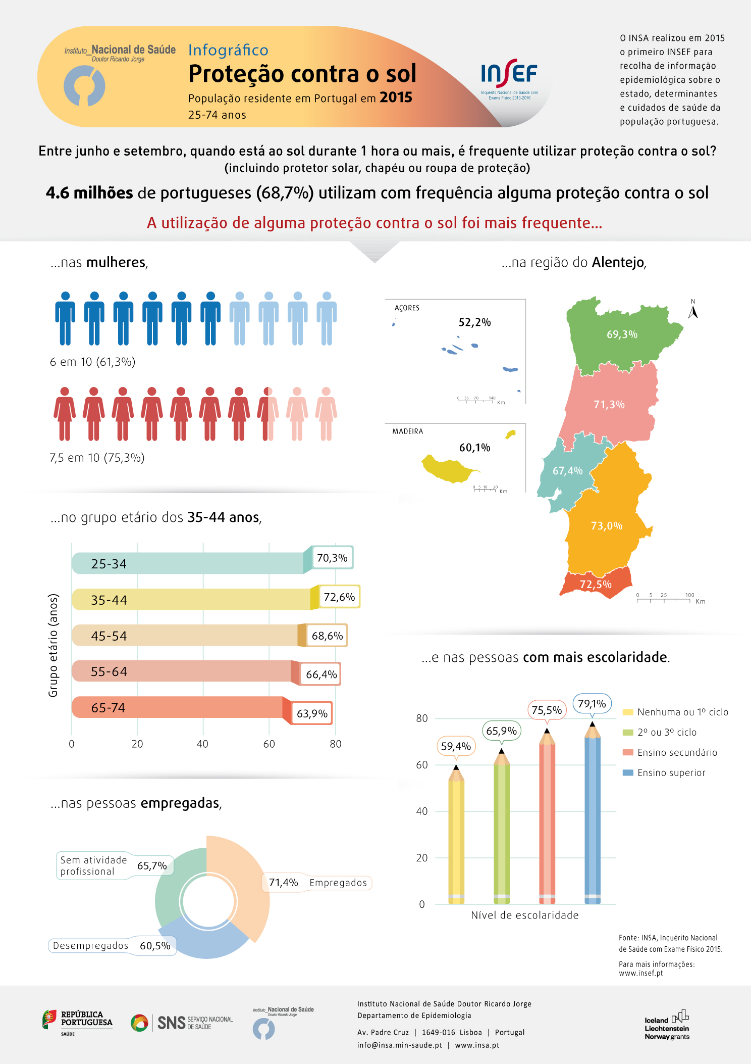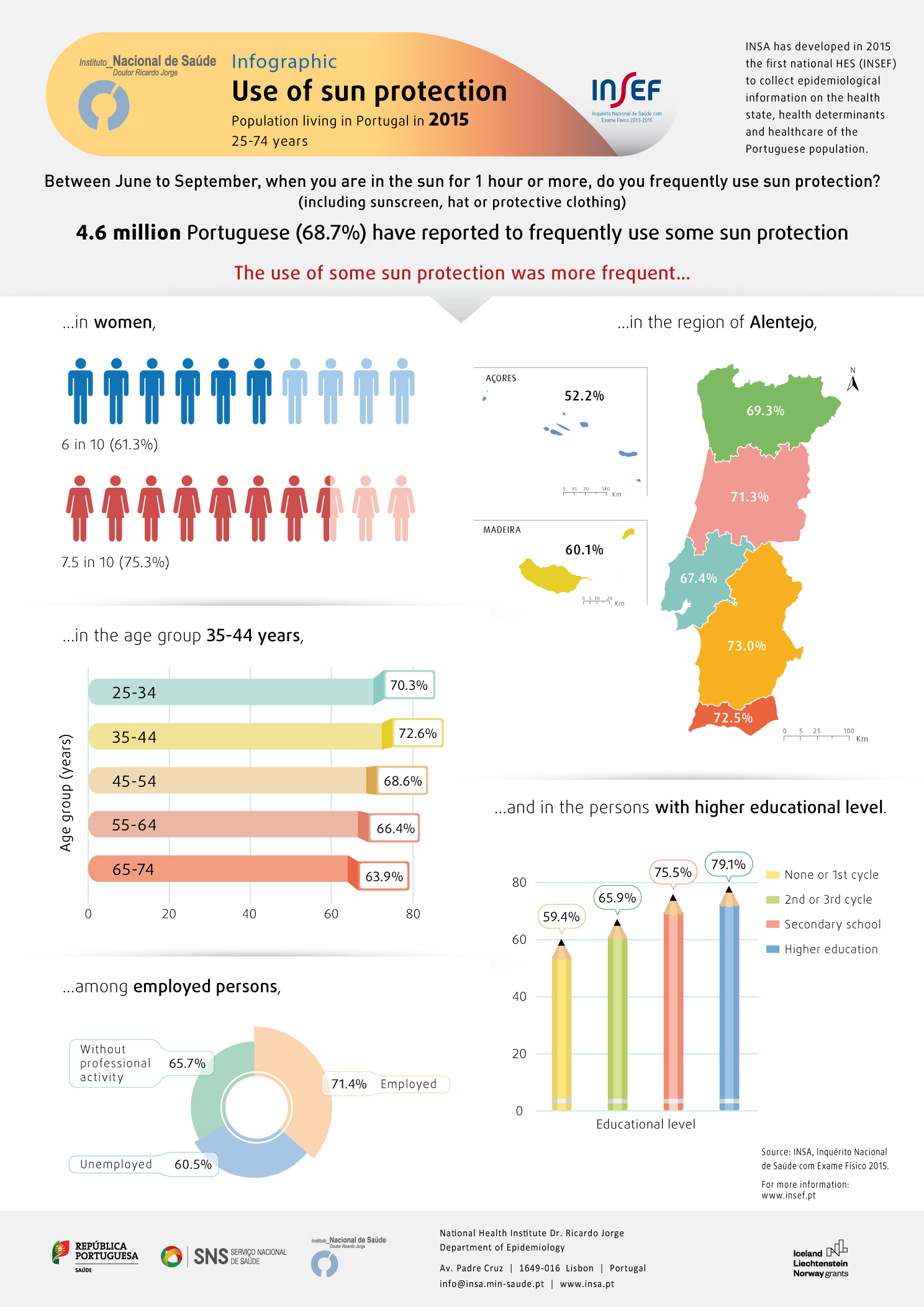 Para uma melhor disseminação dos resultados do Inquérito Nacional de Saúde com Exame Físico (INSEF), o Instituto Nacional de Saúde Doutor Ricardo Jorge, através do seu Departamento de Epidemiologia, disponibiliza em infográfico uma mensagem clara e sucinta sobre este tópico relacionado com a saúde dos portugueses. Os dados apresentados referem-se à população residente em Portugal em 2015 com idades compreendidas entre os 25 e os 74 anos e são relativos à questão «Entre junho e setembro, quando está ao sol durante 1 hora ou mais, é frequente utilizar proteção contra o sol?», tendo 4.6 milhões de portugueses (68,7%) referido utilizar com frequência alguma proteção contra o sol. A utilização de alguma proteção contra o sol foi mais frequente nas mulheres (75,3%), nos grupos etários mais jovens (70,3% e 72,6% entre os 25-34 e os 35-44 anos, respetivamente), na Região do Alentejo (73,0%), nos indivíduos com atividade profissional (71,4%) e nos indivíduos com mais escolaridade (79,1%). A informação está estratificada por sexo, grupo etário, região, situação perante o trabalho e grau de escolaridade. Promovido e coordenado pelo Departamento de Epidemiologia do Instituto Ricardo Jorge, o primeiro Inquérito Nacional de Saúde com Exame Físico (INSEF) foi desenvolvido em 2015 para recolha de informação epidemiológica sobre o estado, determinantes e cuidados de saúde da população portuguesa. Este Inquérito tem como mais-valia o facto de conjugar informação colhida por entrevista direta ao indivíduo com dados de uma componente objetiva de exame físico e recolha de sangue. Este infográfico está disponível, em acesso aberto, em português e em inglês.