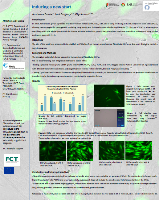 In this work, we ultimately aim to develop induced pluripotent stem cells (iPSCs) from Lysosomal storage disorders (LSDs) patient’s fibroblasts and normal controls to produce disease models. Thus, using iPSCs methods to generate the cell-targets to reproduce the disease may create an ideal model for studying pathogenic mechanisms. The initial biological material being used consists of commercially obtained human control dermal fibroblasts. This type of material guarantees better consistency in technical conditions. We are testing two different non-integrative polycistronic plasmid vectors in order to achieve forced expression of the Yamanaka’s transcription factors. For this achievement, transformation conditions with different vehicles of delivery were tested: different transfection reagents, concentration ratios, and timings were compared.