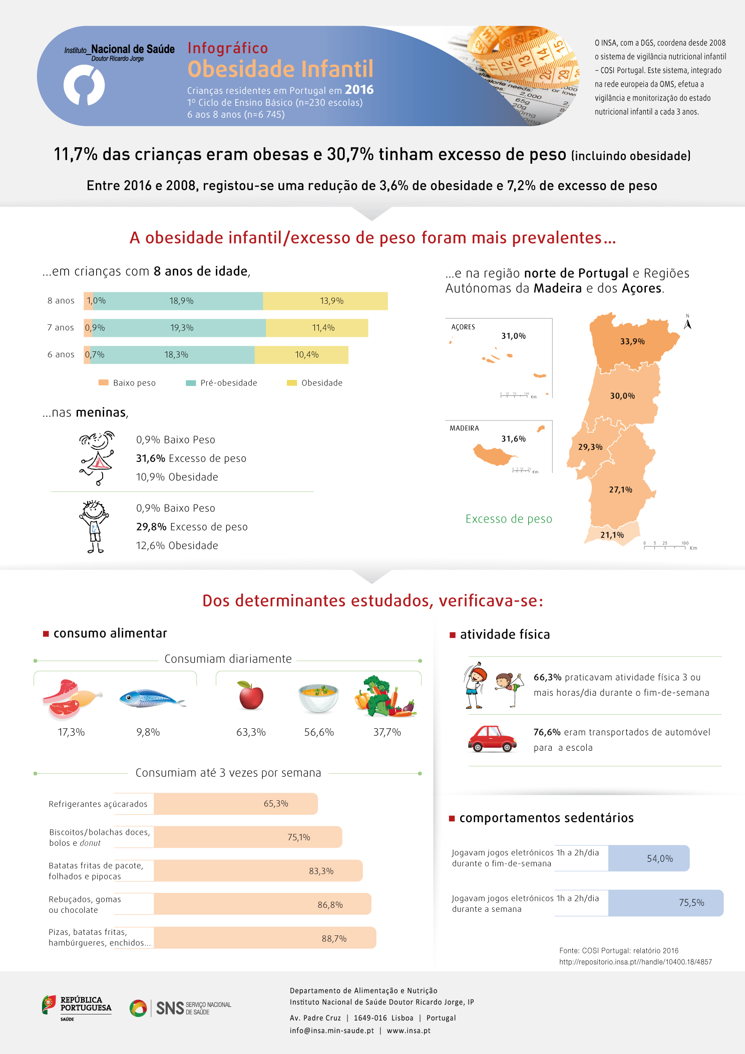 O infográfico apresentado tem como fonte de dados o Sistema de Vigilância Nutricional Infantil − COSI Portugal, referente às crianças no 1º Ciclo de Ensino Básico residentes em Portugal em 2016, dos 6 aos 8 anos de idade. O COSI Portugal teve início em 2008 e é coordenado pelo Departamento de Alimentação e Nutrição do Instituto Ricardo Jorge, em articulação com a Direção-Geral da Saúde e com a colaboração, a nível regional, de todas as Administrações Regionais de Saúde e das Direções Regionais de Saúde das RA dos Açores e Madeira. Integrado na rede europeia da Organização Mundial da Saúde, este sistema tem como objetivo a vigilância e monitorização do estado nutricional infantil a cada 3 anos.