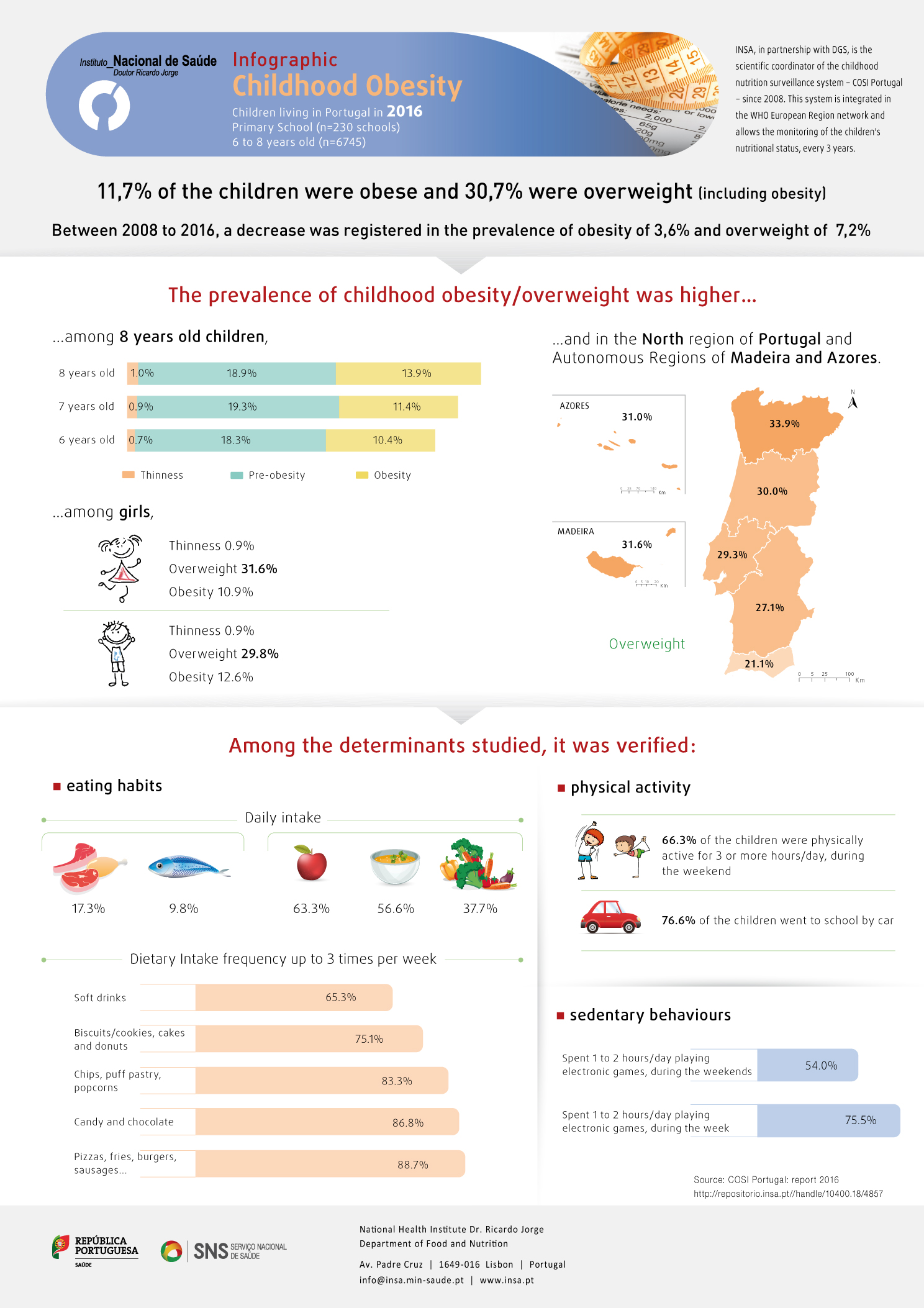 Para uma melhor disseminação de resultados obtidos sobre vários tópicos relacionados com a saúde dos portugueses, o Instituto Nacional de Saúde Doutor Ricardo Jorge, através do seu Departamento de Alimentação e Nutrição, disponibiliza um infográfico sobre a obesidade infantil.