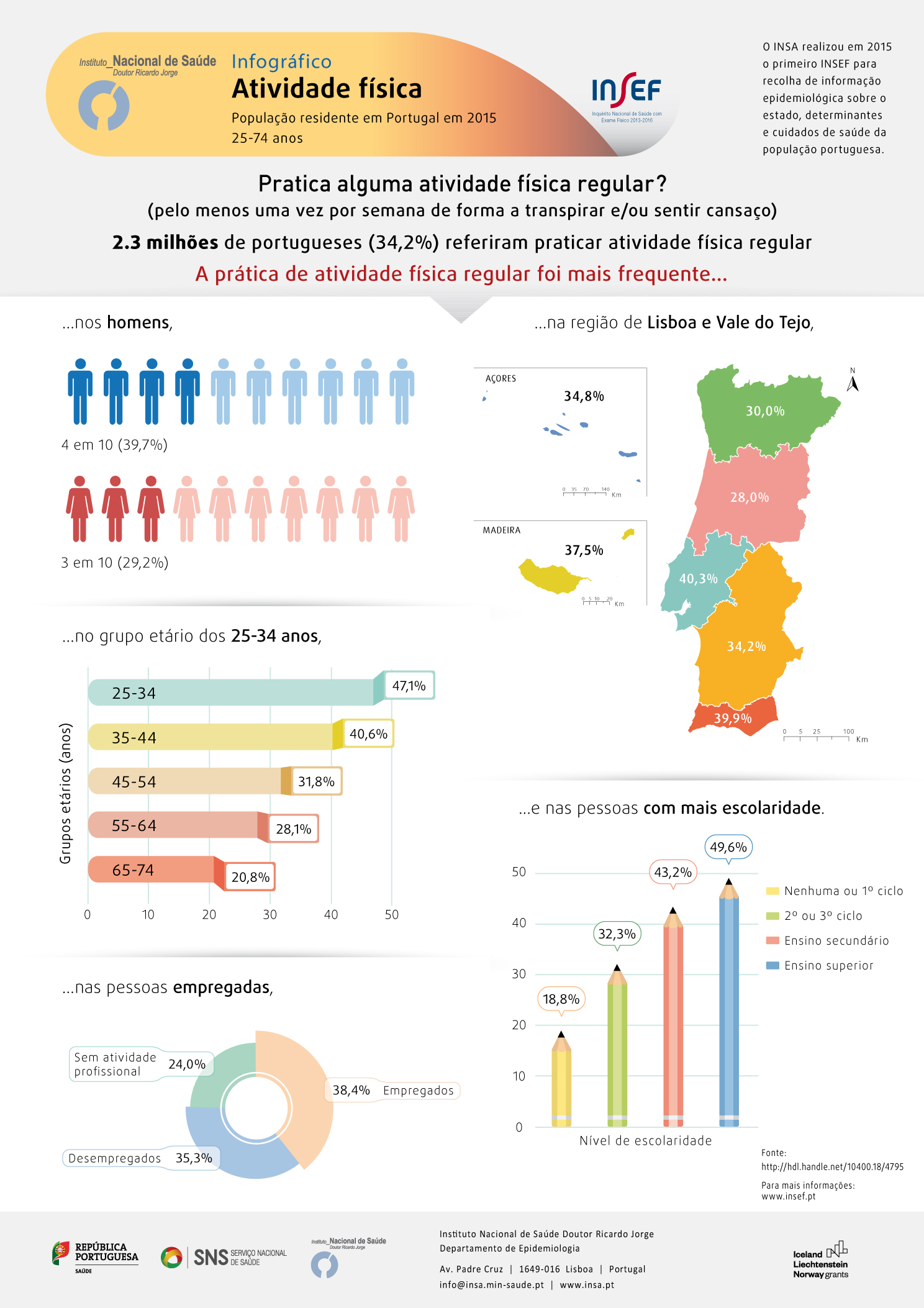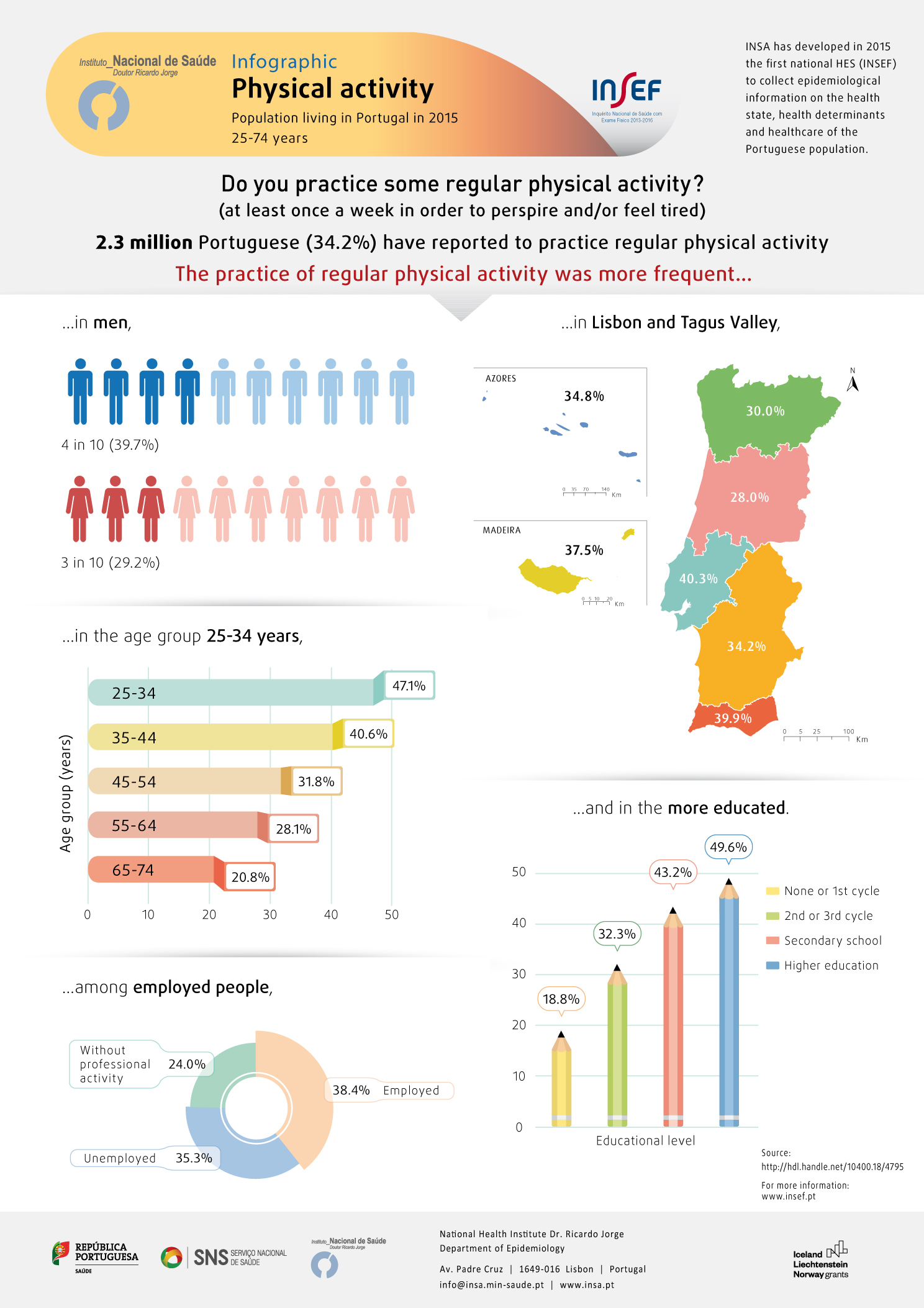 Para uma melhor disseminação dos resultados do INSEF, disponibiliza-se em infográfico uma mensagem clara e sucinta sobre este tópico relacionado com a saúde dos portugueses. Os dados apresentados referem-se à população residente em Portugal em 2015 com idades compreendidas entre os 25 e os 74 anos e são relativos à questão «Pratica alguma atividade física regular, pelo menos uma vez por semana de forma a transpirar e/ou sentir cansaço?», tendo 2.3 milhões de portugueses (34,2%) referido praticar atividade física regular. A prática de atividade física regular foi mais frequente nos homens (quatro em cada dez), no grupo etário mais jovem (47,1%), na região de Lisboa e Vale do Tejo (40,3%), nas pessoas empregadas (38,4%) e nas pessoas com mais escolaridade (49,6%). A informação está estratificada por sexo, grupo etário, região, situação perante o trabalho e grau de escolaridade. Promovido e coordenado pelo Departamento de Epidemiologia do Instituto Ricardo Jorge, o primeiro Inquérito Nacional de Saúde com Exame Físico (INSEF) foi desenvolvido em 2015 para recolha de informação epidemiológica sobre o estado, determinantes e cuidados de saúde da população portuguesa. Este Inquérito tem como mais-valia o facto de conjugar informação colhida por entrevista direta ao indivíduo com dados de uma componente objetiva de exame físico e recolha de sangue.